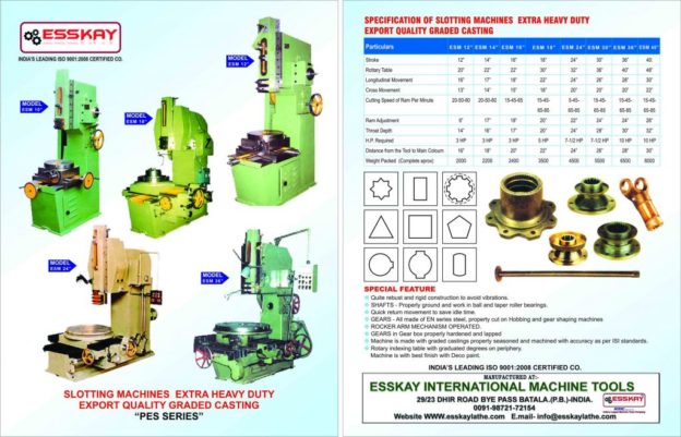 We Esskay Lathe and Machine equipment in Batala offer a Wide Range of Slotting Machines that gave Stroke alteration Facility changes from various sizes that are the up-to-the size of machine-like on the off chance that machine limit is 300 mm, at that point a modification should be possible from 10 mm to 300 mm.